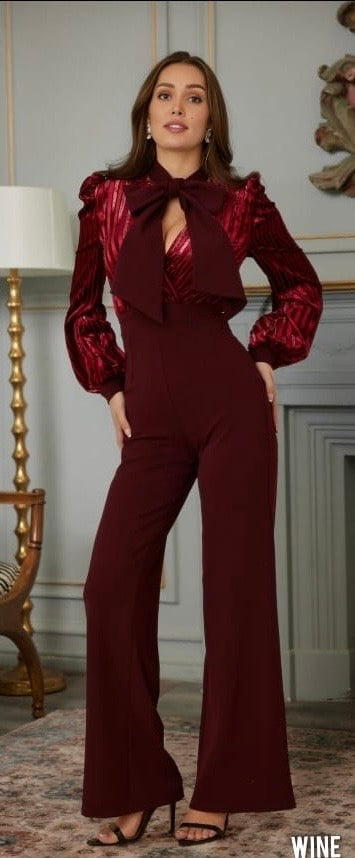 The Melissa Jumpsuit exudes elegance and sophistication with its shimmery velvet pattern and bow tie detail. This jumpsuit also features a convenient zipper back for easy wearing. Elevate your style and make a statement at your next event with this stunning piece.